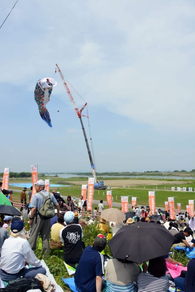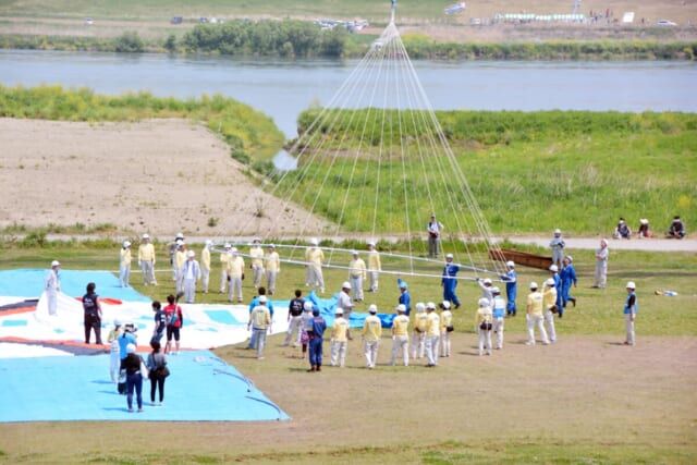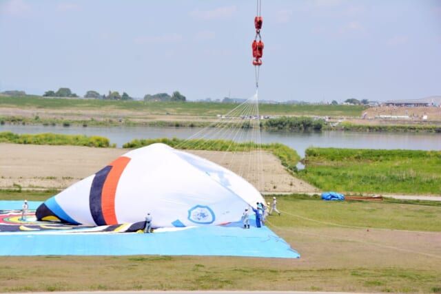 「こい」がまん丸の形に口を開けると、クレーン車がロープを引き上げ始めます。河原に敷かれていたときには巨大な絨毯のようにも見えた「こい」は、口から空気を吸い込み巨体が膨らんでいくのです。