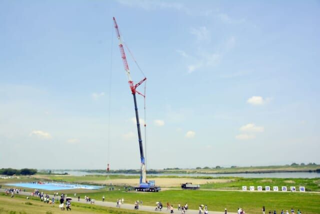 ところが、憩いの場の一画にクレーン車が、どっしりとした姿で停車しています。娯楽とは無縁の建設工事用車両が、ゴールデンウィークのイベントの脇役として大活躍するのです。日本一大きな「こいのぼり」を引き上げるために、怪力を発揮してくれます。加須市の「ジャンボこいのぼり」は、何と全長約100メートル、重さ約330キロの巨体。人の力ではびくともしないことでしょう。そこで、クレーン車が利用されるのです。