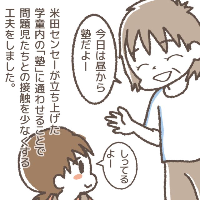赤井ふみさんは、米田先生が立ち上げた学童内の塾に娘ちゃんを通わせることで、問題児たちとの接触を少なくする工夫をしていたのです。