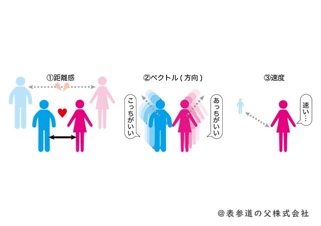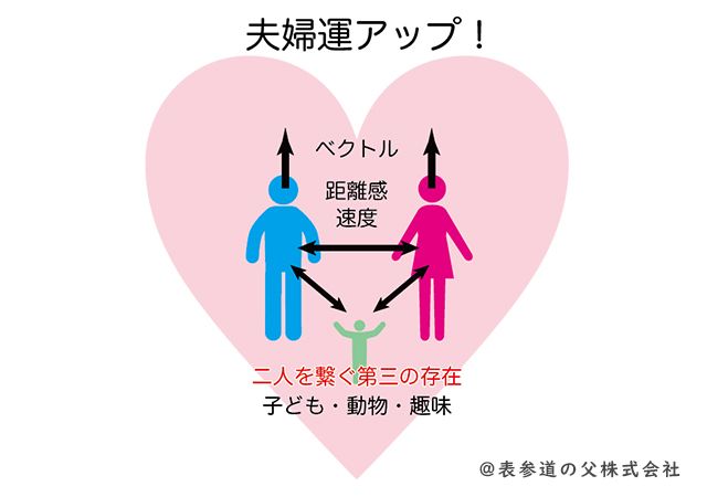 また、変化したこの関係を修復できる方法として夫婦での子育てや、ペットの世話を共同でおこなったり、同じ趣味や仕事を持ったりすると、距離・ベクトル・速度が合いやすくなってきます。