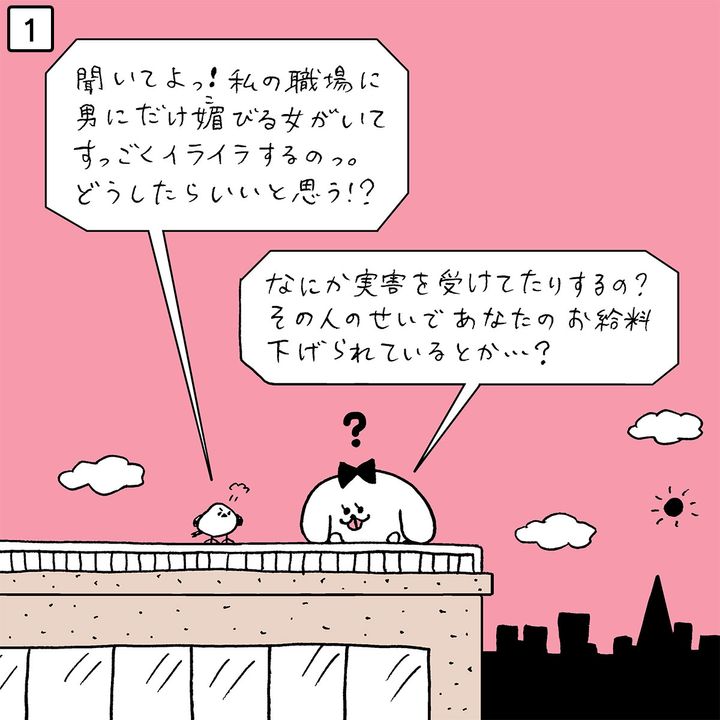 男性と話すときだけ、声色が変わったり、距離感がバグっている人ってたまにいますよね。見ているだけでイライラ、気にしないつもりなのについ注目してしまってイライラ……。とはいえ、具体的な被害があるわけではないから、注意するわけにもいかないし、にんにんが言う通り「スルー」するしかないのです。
