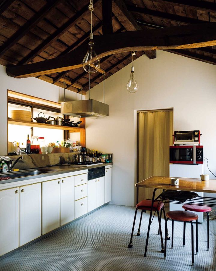 祖母が使っていたステンレス流し台や家具をそのまま引き継いだキッチン&ダイニング。天井を取り除き、梁と屋根を現しにして空間に広がりを生み出した。床は丸モザイク。