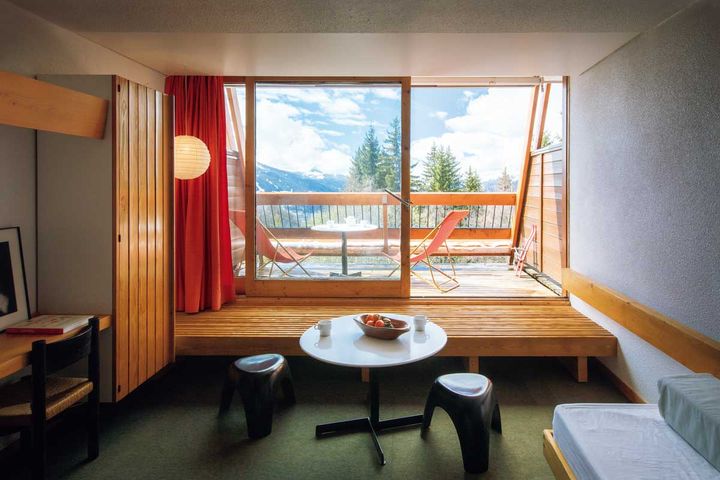 極小居住空間の機能とモダニティを長年追求したシャルロット・ペリアンが、建築と内装を手がけた山岳リゾート〈アルク1600〉の河村家のリビング。ベンチとテラスの連続が内と外を視覚的につなげ、住空間を拡張する。