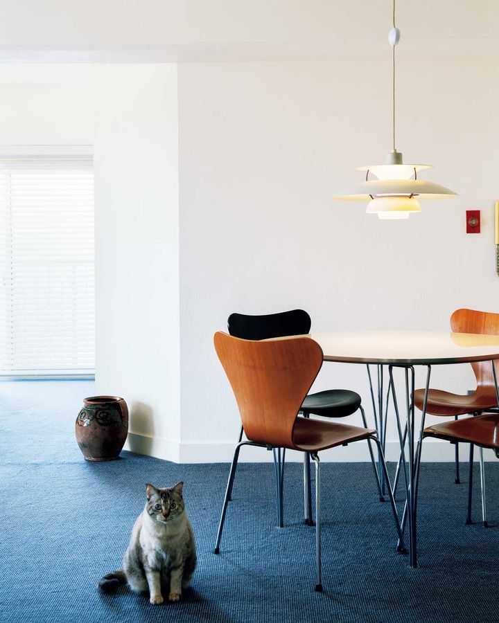 築45年のマンションを改築した池田邸。ダイニングの奥に見える仕切り壁の内側は寝室。壁の角を斜めに切って見通しをよくした。家具は20年以上使っているアルネ・ヤコブセン。