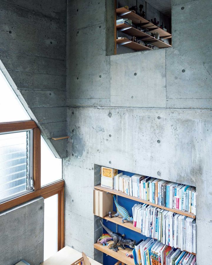 玄関ホールから見上げると、寝室の小窓が見える。コンクリートを切り欠きにした本棚、木製フレームの建具など、ほぼ竣工当時のまま使われている。恐竜は息子が好きで集めた。