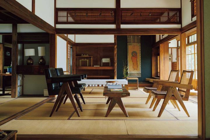 1934年に建てられた日本家屋。ほぼ手を加えていない畳敷きの和の空間に、同時代のものといえるピエール・ジャンヌレのイージーチェアやテーブルが驚くほどすんなり馴染む。