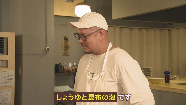 オーナーシェフ磯部さん:「しょうゆと昆布の泡です。鶏のスープに昆布だしを合わせるのが一般的ですが、鶏と昆布を別々にし、1つの皿の中で初めて調和するようにした。雑味がなく、相乗効果でよりうまみが引き立つ。」
