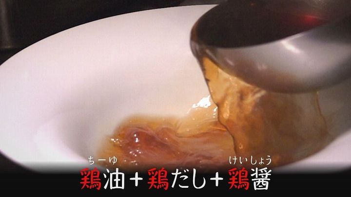 鶏の油、鶏油が入った器に注ぐのが、鶏のだし、鶏の醤油を合わせた極上スープ。