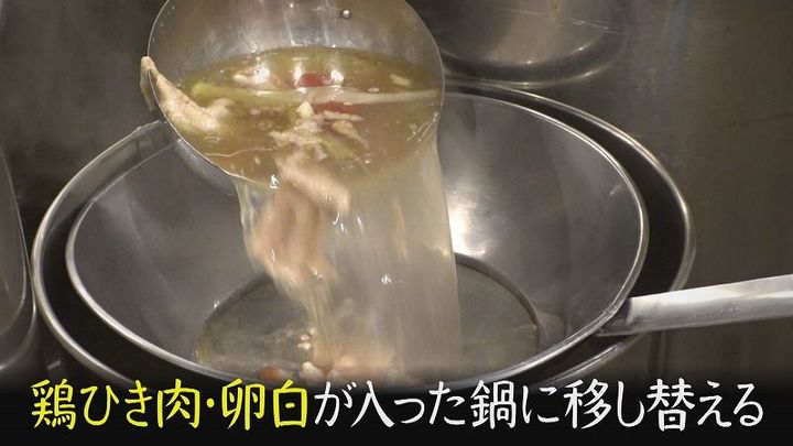 それを鶏ひき肉や卵白が入った鍋に移し替え、さらに火を入れます。