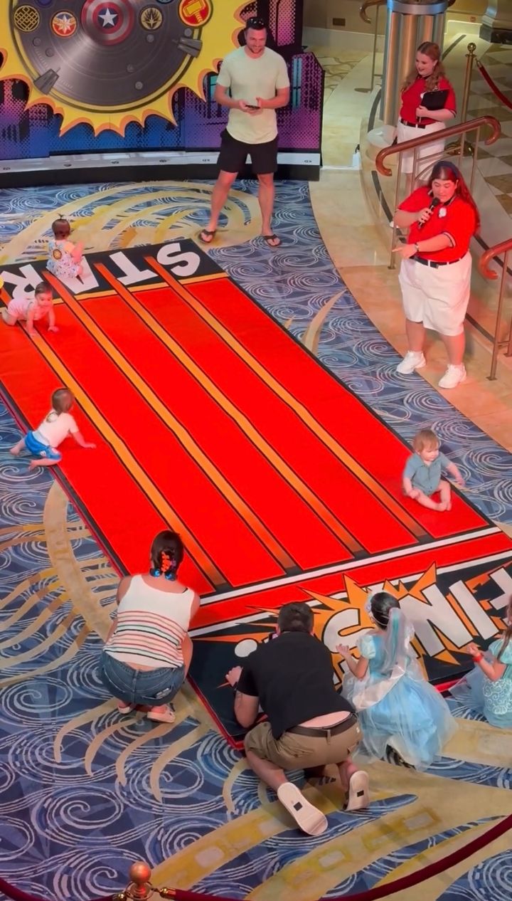 赤ちゃんたちによるレースが開幕! お尻歩きでゴールを目指す子もいれば、高速ハイハイで追い上げる子もいて・・・と、それはまさに世界一かわいいレース!!