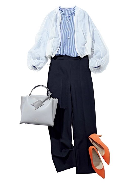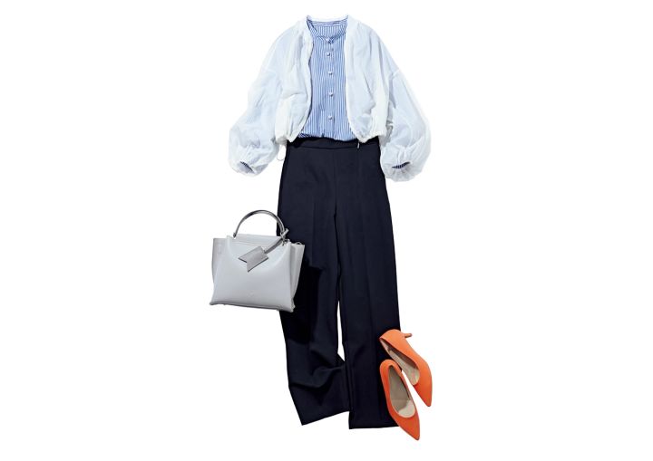 セットアップ(パンツ)¥19,910/ミラ オーウェン ルミネ新宿2店 シアーブルゾン¥17,930/アンクレイヴ スタンダード(オンワード樫山) ストライプブラウス¥8,990/PLST 2WAYボストン¥6,996/デッサン(ワールド) ポインテッドトウパンプス¥7,500/オリエンタルトラフィック(ダブルエー)