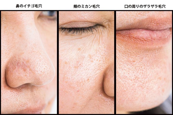 「鼻のイチゴ毛穴」・「頰のミカン毛穴」・「口の周りのザラザラ毛穴」