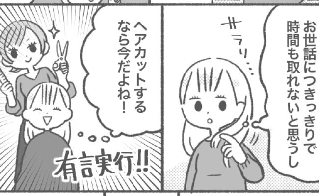 産後1カ月が過ぎたころ、私はショートヘアにしたことをとても後悔していました。美容院に行ってからもう3カ月が過ぎ、髪の毛もだいぶ伸びてきたころです。おむつ替えや授乳で下を向くことが多く、伸びてきた髪の毛が顔にかかってうっとうしいのに、まだ結べる長さではない時期でした。