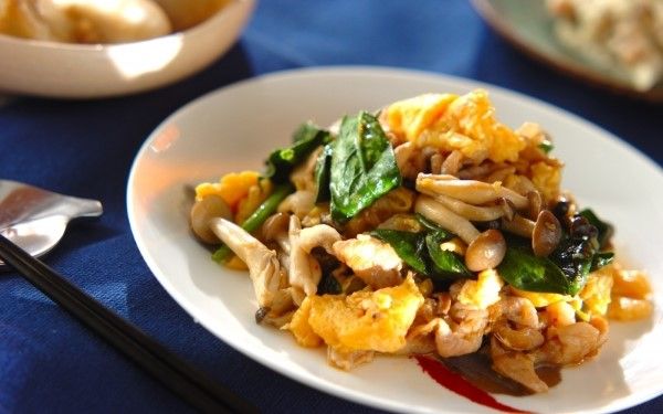 豚こま肉、シメジ、ホウレン草、卵をオイスターソースで炒める大人気レシピです。しっかり味でご飯が進み、一品で栄養バランスも良し。辛いのが好きな方は豆板醤を少量加えると◎。