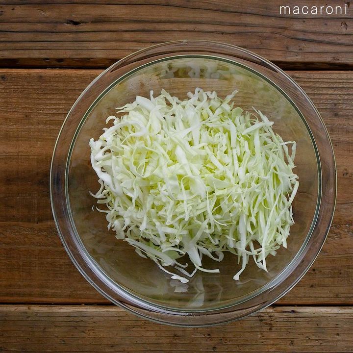 1: 春キャベツを千切りにしてボウルに移し、塩を加えて軽く揉み込みます。10分ほど置いてしっかりと水気を絞ります。