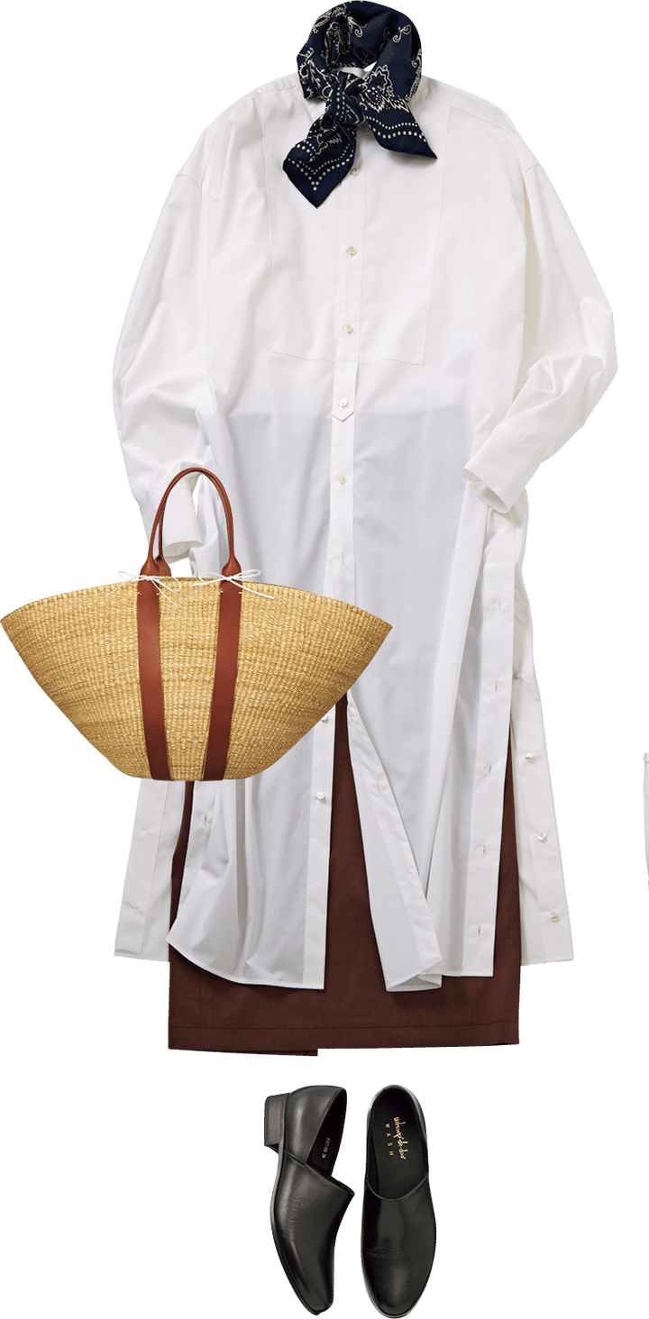 【DAY 20】シャツドレスの裾からテラコッタのスカートをチラリと覗かせて。襟元のバンダナが顔まわりを華やかに。