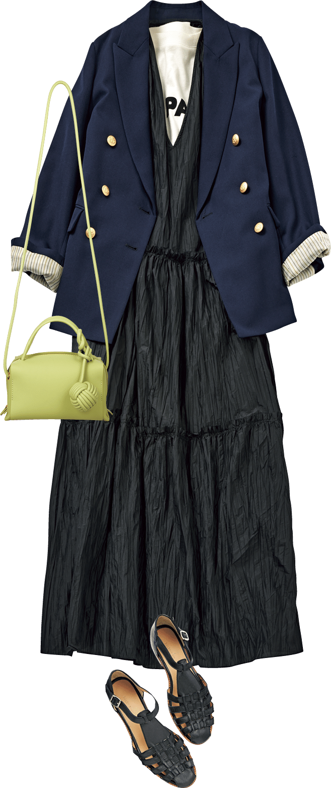 【DAY 19】たっぷりとしたドレスだから中にTシャツを重ねても。イエローのバッグで軽やかなアクセントを。