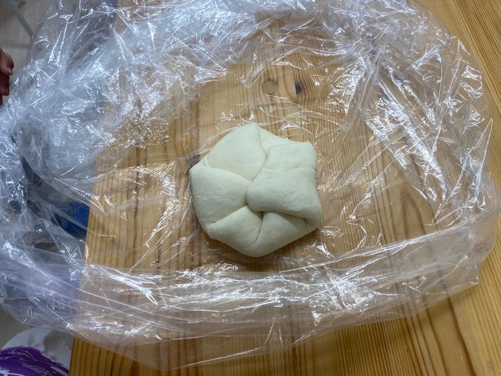 ・生地の角を中心へ折り、折り目をおさえて空気をしっかり抜きます。新しくできた角をまた中心へ、この工程を繰り返すと丸くなっていきます。