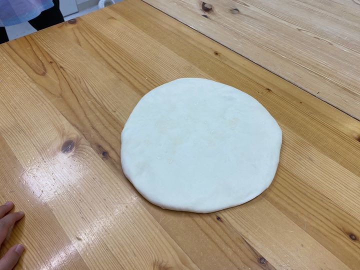 ・作業台にも生地の上にも、軽く打ち粉を振っておいて、円盤の生地を四角になるよう形を変えていきます。