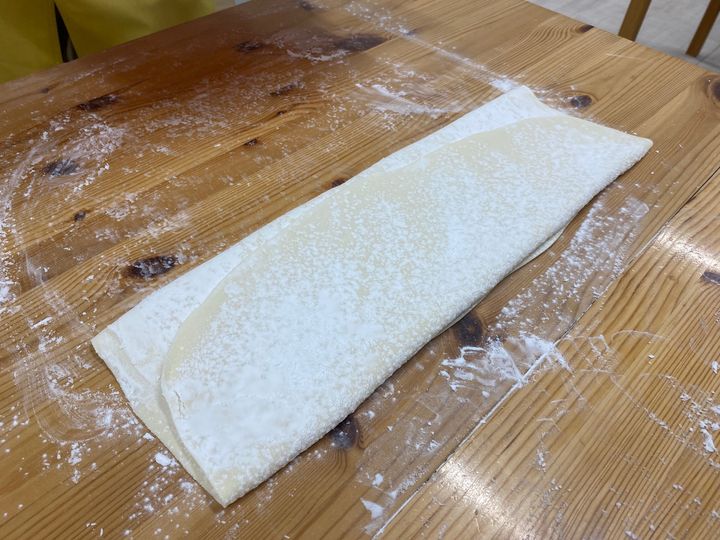 ・表にも裏にもしっかり打ち粉をして、三つ折りに。
