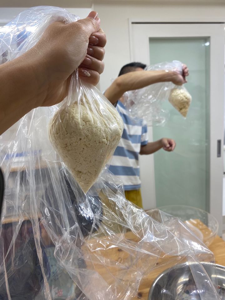 ・ポリ袋を広げて、かたまりになった生地を袋の真ん中にし、床の上に置きます。