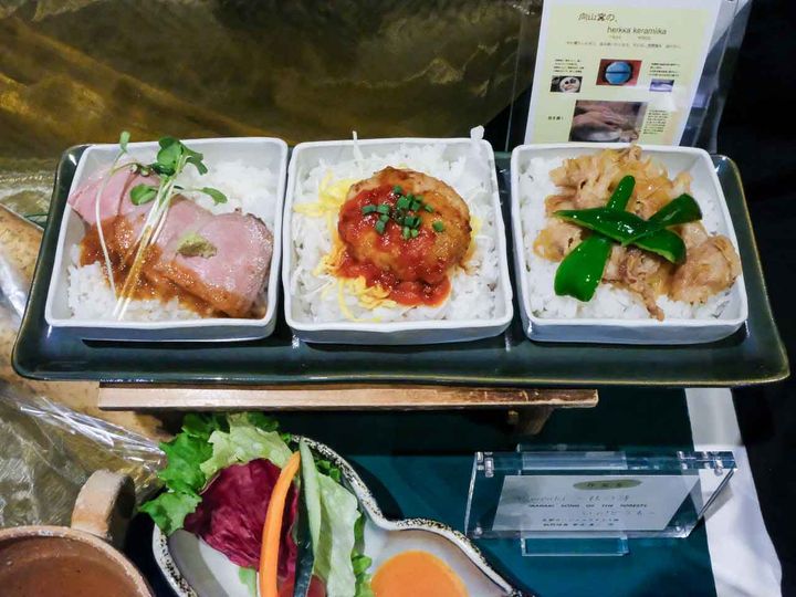 3種類の料理がオンザライス! って贅沢ですよね。左から「常陸牛ローストビーフ丼」、「つくば鶏いりつくね丼」、「つくば美豚の生姜焼き丼」です。