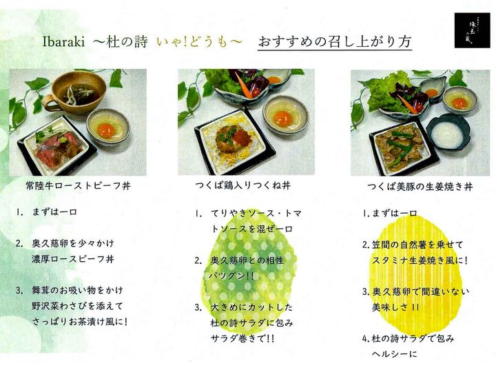 そして、おすすめの食べ方がこちら。ローストビーフはお吸い物をかけたり、つくねには卵はもちろん合うし、サラダに巻いても。生姜焼き丼には自然薯をプラスでスタミナアップと、いろいろ楽しくておいしそうです。