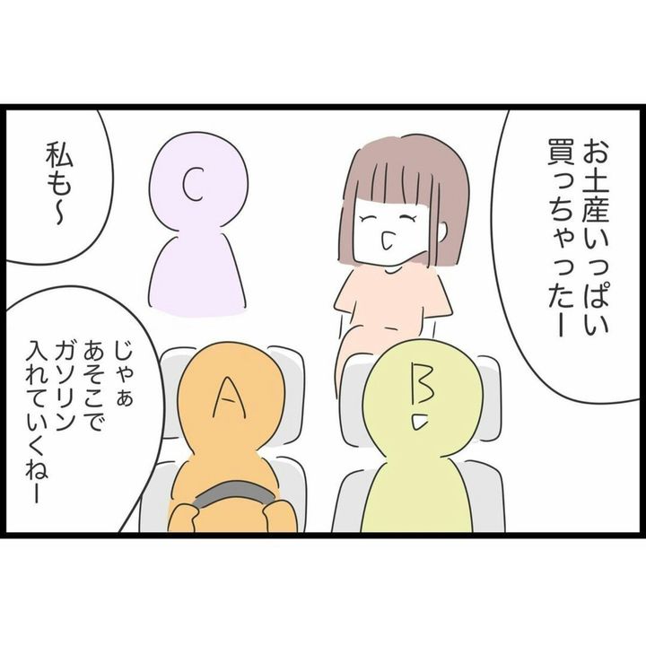 旅行などで「自家用車に乗せてあげる」あるいは「乗せてもらう」という経験はありませんか。そんなとき、ガソリン代はどのようにやりとりしているでしょうか。本作では、いつも車を出すすみれに対し、友人たちはガソリン代も出さずに知らん顔。すみれは当初「こんなものなのかな」と思っていましたが、別の友人に「それは非常識」と聞き、モヤモヤをつのらせていきます。