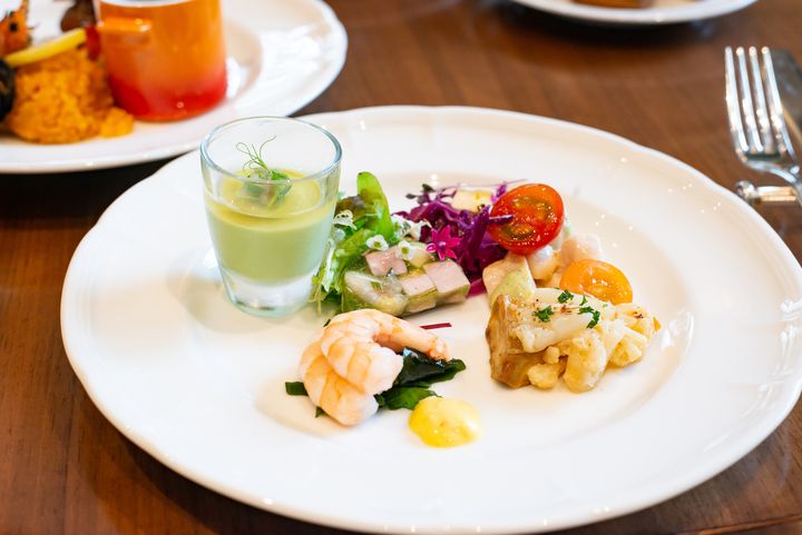 こちらは、冷菜の盛り付けの一例。ハムや豚足、パセリなどをゼリー寄せにした「ジャンボンブランとパセリのアスピック」(中央部)、フランスの郷土料理「サン・ジェルマン」をイメージした「グリーンピースのムース」(左上)、エビのぷりぷりとした食感が引き出された「シュリンププラッター」(左下)などが配されています。
