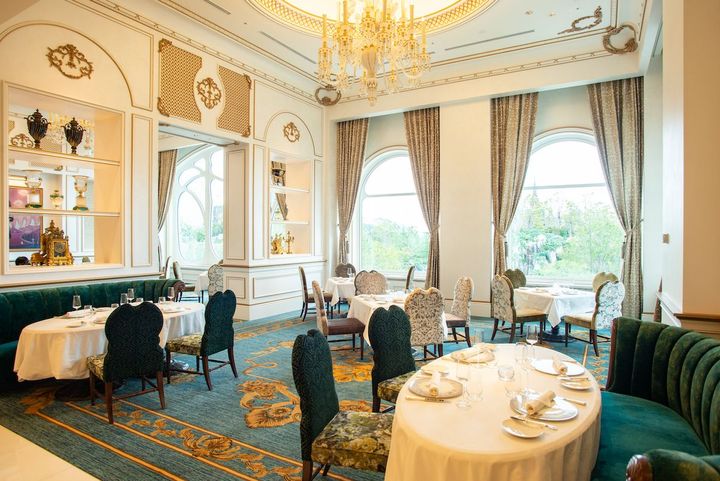 グランドシャトーの3階にあるフレンチダイニング「ラ・リベリュール」も、ぜひチェックを。こちらはグランドシャトーの宿泊者のみ利用できるダイニングで、本格的なフレンチを提供しています。また、内装もとっても素敵。華やかで高級感のあるインテリアが配されており、空間全体にフランスの貴族の館のような雰囲気が漂っています。また、壁には『美女と野獣』のワンシーンを再現した絵も。こうした装飾により、フランスと『美女と野獣』の世界観が融合した、唯一無二の空間に仕上がっています。