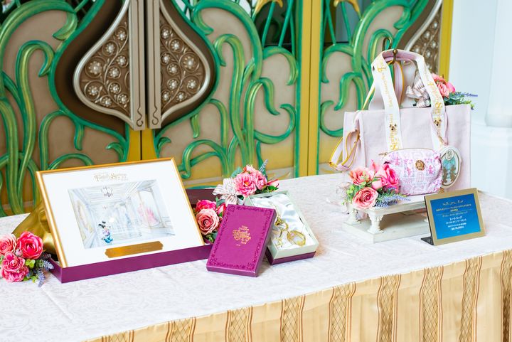 「ファンタジースプリングスホテル」では、宿泊者のみ購入できる限定商品も扱っています。写真左と中央にあるのは「グランドシャトー」の宿泊者のみ購入できる「スペシャルアートフレーム」4万6000円と「スペシャルキーホルダー」9000円。「スペシャルアートフレーム」を購入すると、フレーム上のプレートにメッセージや名前、宿泊日などを刻印することができます。