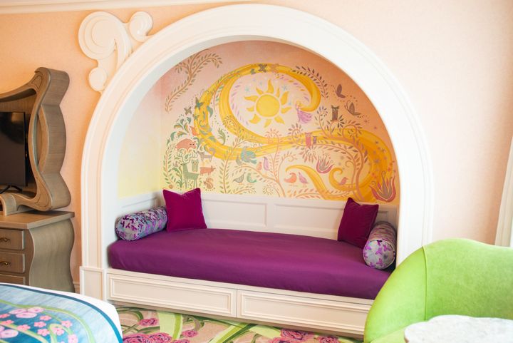 壁紙やベッド、アルコーヴベッドなどには、ディズニー映画『塔の上のラプンツェル』『バンビ』のキャラクターや草花をモチーフとした装飾があり、ディズニーファンタジーの世界観を存分に感じとることができます。ひとつひとつの装飾をじっくり眺めるうちに、ディズニーアニメーションの世界に引き込まれていくような感覚に。