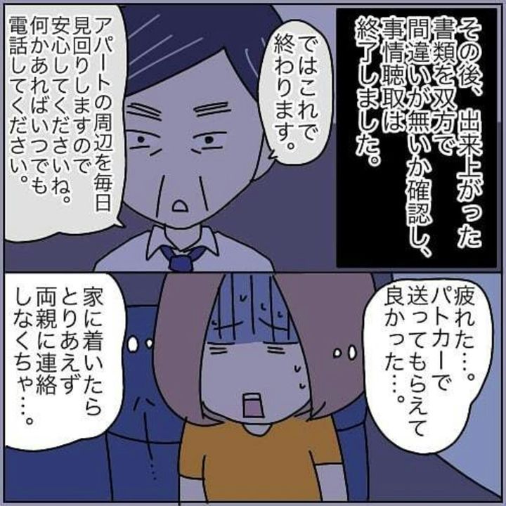 犯人は彼氏の可能性もあると言われた加藤かと(@kato_usausako)さん。むしろこういう事件は彼氏である場合が多いとか。衝撃的な話を聞き、かとさんは不安を覚えます。侵入者は誰だったのでしょうか。かとさんの体験談を漫画にした『本当にあったちょっと怖い話』第14話をごらんください。(この漫画には女性を狙った犯罪の描写が含まれます。苦手な方はご注意ください)