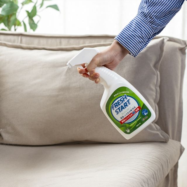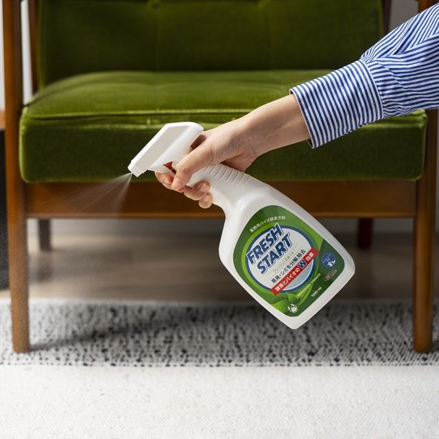 フレッシュスタートを臭いの元やシミ汚れに浸透するよう十分にスプレーし、やわらかいブラシ・スポンジ等で軽くこすり、その後、自然乾燥させればOK! 頑固な臭い、汚れにはこの作業を何回か繰り返します。