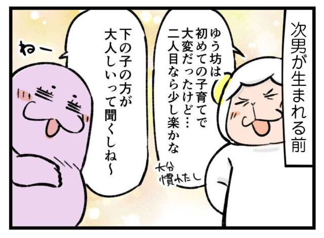 5歳長男ゆう坊くん、1歳次男そう次郎くん兄弟のパパである左近寺しゅうりさんから、思っていたのと違ったお話です。次男そう次郎くんが生まれる前、「二人目なら少し楽かな」「下の子は大人しいって聞くよね」と夫婦で話していた左近寺しゅうりさん。実際は・・・。