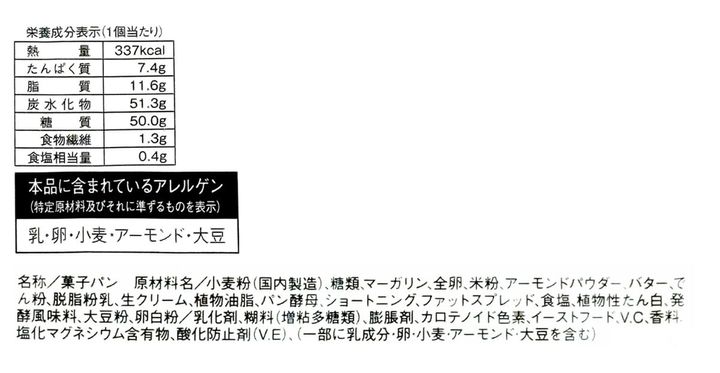 気になるカロリーは1個337kcal、糖質は50.0gです。