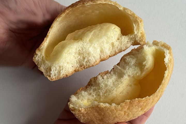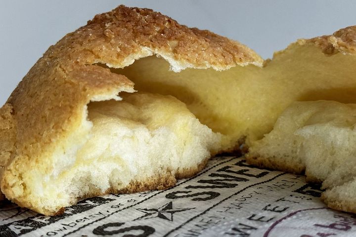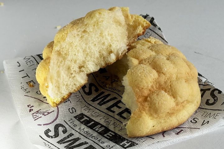 ビスケット生地には米粉が配合されていて、サックリ感があります。中のパン生地は生クリーム入りで、しっとりソフトにしているそう。全体的にやさしい甘さで、 中のパン生地がふんわりなので、のどが詰まるようなこともなく、最後までおいしくいただけます。