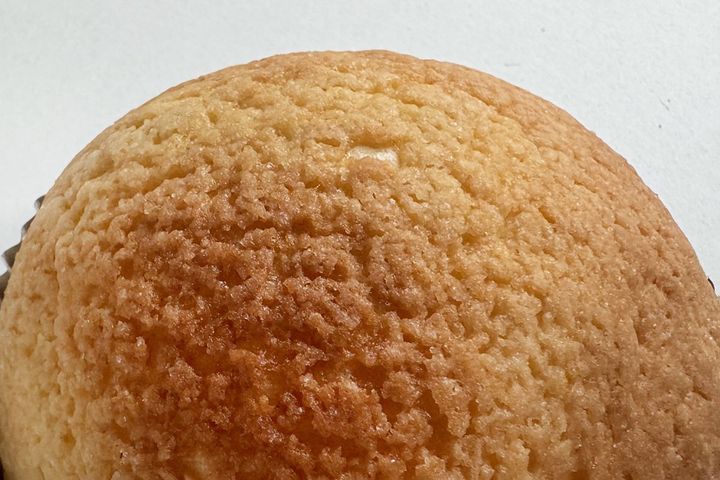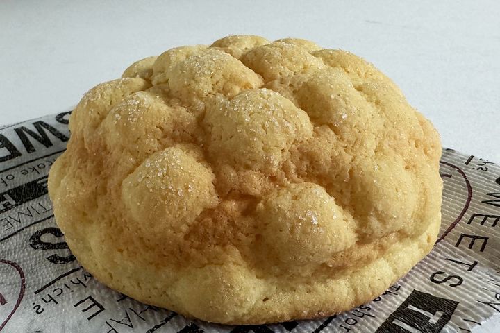 メロンパンは、パン生地の上にビスケット生地をのせて焼いたパンのことで、表面に格子状の模様が付いているのが一般的です。でも、「じゅわバタ塩メロンパン」に格子状の模様はなく、表面は小さな凹凸のあるクレーター状になっています。