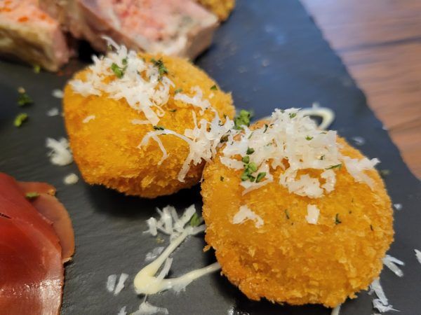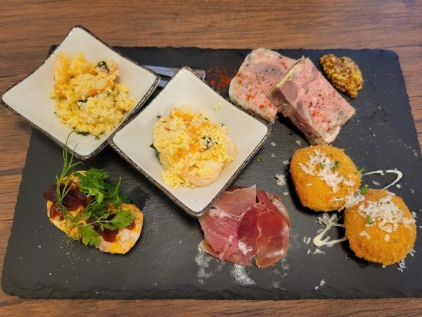 お洒落ですね。綺麗です。生ハム・砂肝と白レバーのパテドカンパーニュ・シェリービネガーを使用した洋風あん肝にコロッケ!