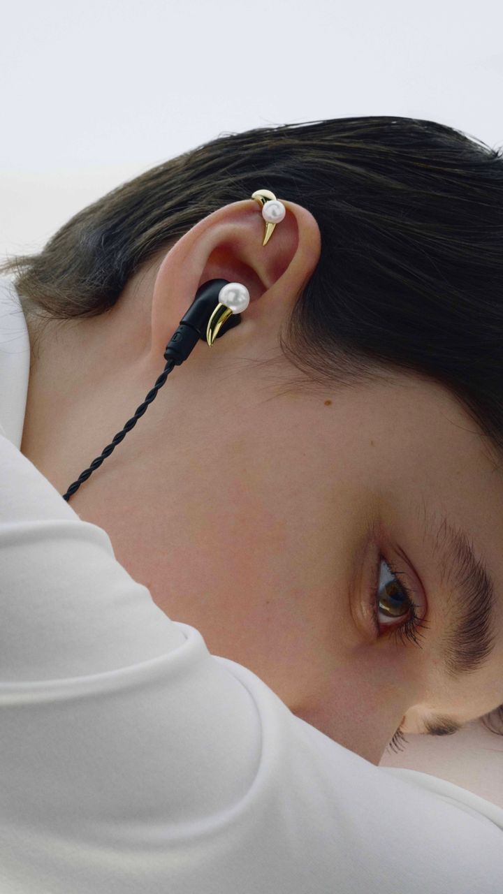 デインジャー ファング イヤホン[本体:アルミニウム、アクセサリー部分:あこや真珠、真鍮(ゴールドコーティング)、ケーブル:ハイグレードリッツワイヤーケーブル]¥264,000(タサキ)