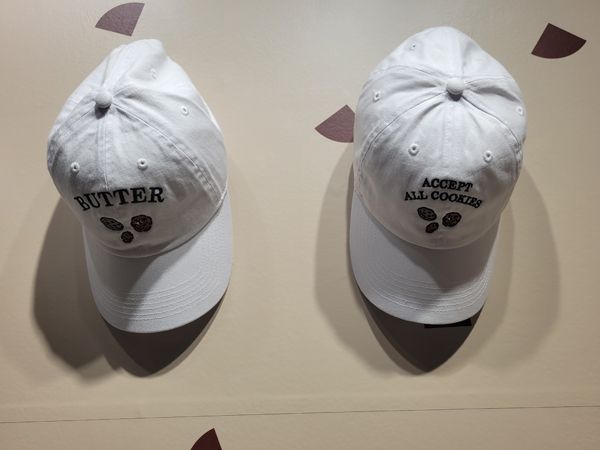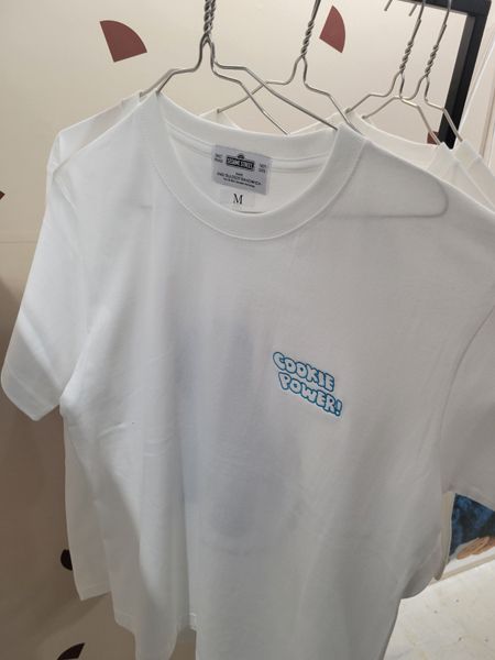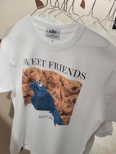 ほかにも人気のシーズナル商品、クッキーモンスターをモチーフにしたオリジナルTシャツやキャップ、缶バッジなどのグッズがずらり。