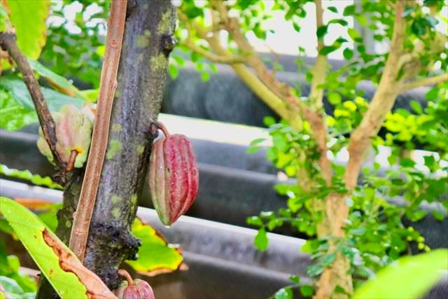バナナやココヤシなど、私たちになじみ深い熱帯の植物も多いBドーム。カカオの実が実際になっている様子も見ることができました。木の幹に直接実がついているのは驚きです。