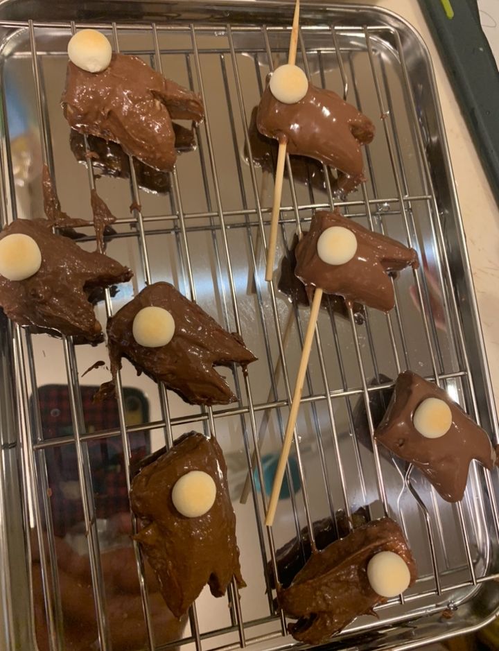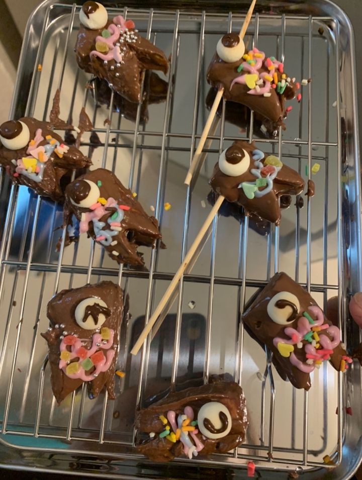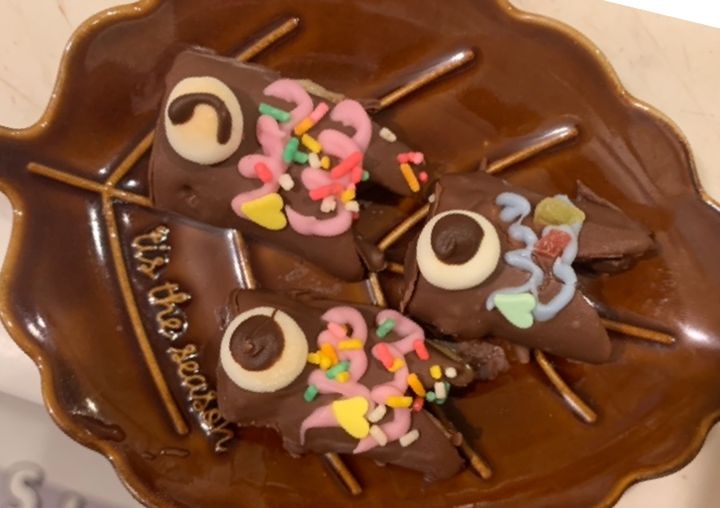 先程のチョコペンでデコったり、これまた家にあったマーブルチョコをうろこ代わりに飾りつけしましたよ☆