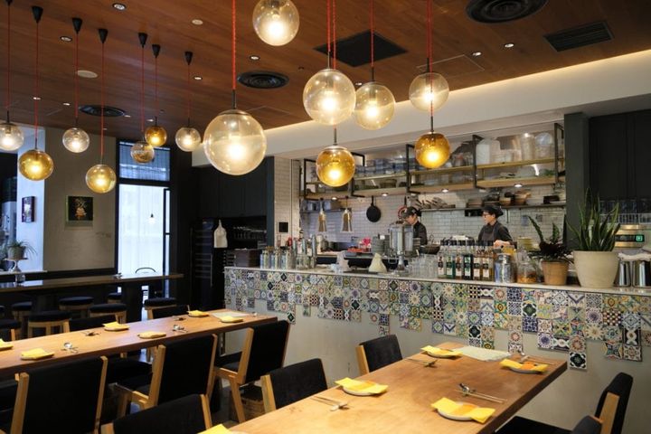 キッチンに貼られたタイルなど、イメージしていたタイとはちょっと違う、モダンな雰囲気。ブルーやエメラルドグリーンの色合いが、ヨーロッパにあるレストランに来たような気分になれます。