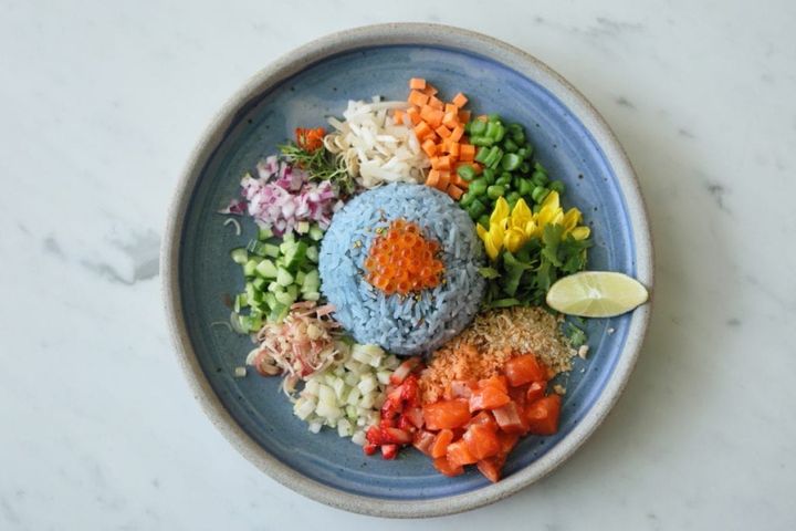 清水さんが食べてみたかったというカオヤムは、魚を発酵させて作った魚醤を使ったタイ南部の料理。カオはごはん、ヤムは和えるを意味し、バタフライピーで染めたブルーのジャスミンライスのまわりに、色とりどりの季節の野菜とハーブ、フルーツ、魚介類がたっぷりの美しい一皿です。