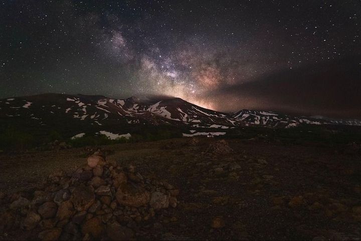 北海道・十勝岳のふもとで、深夜に天の川が現われた瞬間をおさめました。