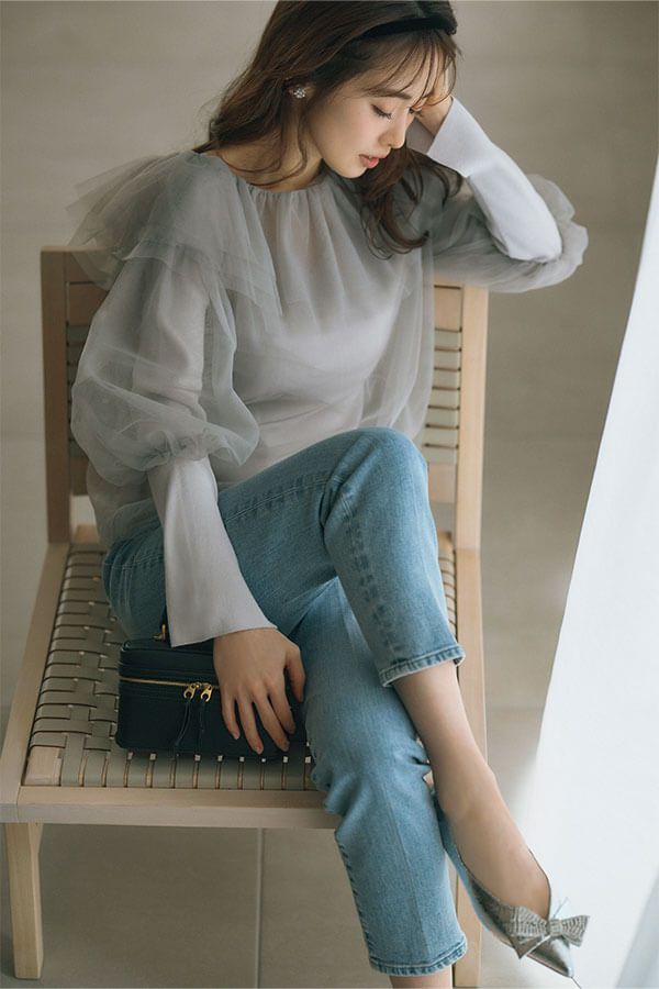 プレーンなニットにチュールブラウスをレイヤードしたセットトップス。チュールの甘さをカジュアルなデニムとピリ辛小物で引き算。