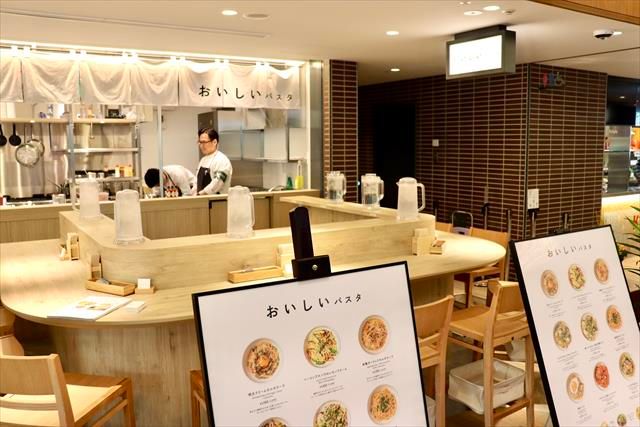 お店の外観は明るくシンプル。「おいしいパスタ」と書かれたのれんが特徴的で、フードホールでよく目立ちます。カウンター席からは、厨房の様子ものぞくことができますよ。