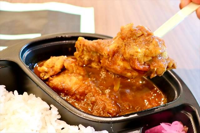 少し赤みがあるルーには、ごろっとした骨付きの手羽元が2ピース入ってインパクト大。小麦不使用なので、スプーンですくってみると、さらさらとしたテクスチャです。