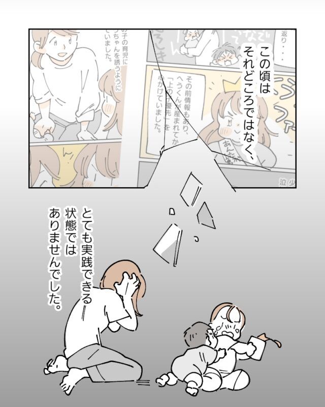 へうくんが動くようになり目が離せなくなったこと、くうちゃんのトイレの付き添いやプレ幼稚園の参加が始まったことでマキノさんの育児疲れはどんどん溜まっていきました。心身ともに疲弊していったマキノさんはイライラすることが増え、余裕がなくなり子ども達に感情的に怒るように・・・。そして、マキノさんのイライラはくうちゃんに伝わって・・・。